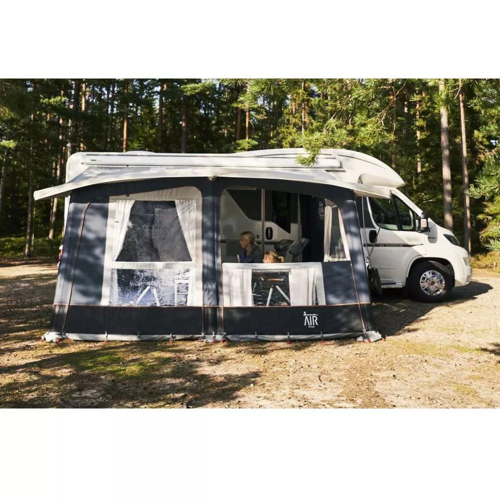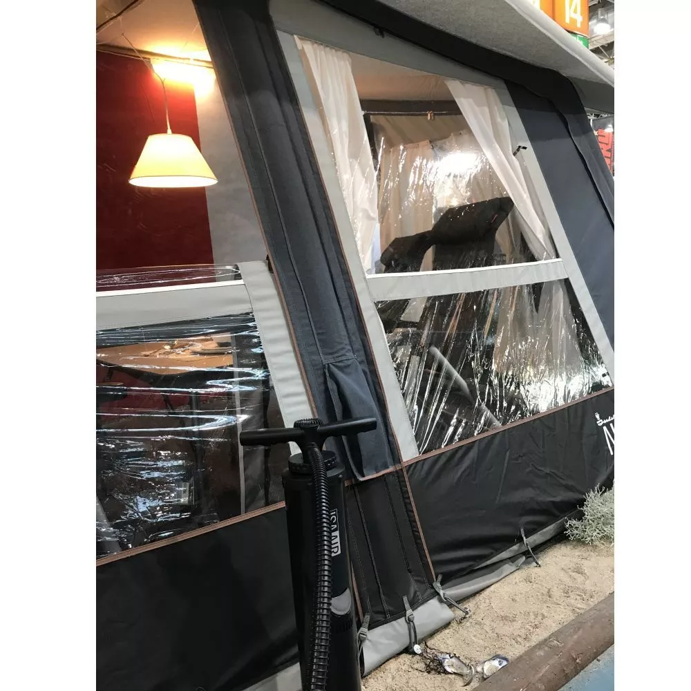 Eine Besonderheit ist der aufblasbare Vordachüberstand, das auch als Regenschutz bei geöffneten Front- und Seitenteilen und bei Sonnenschein für Schatten im Zelt sorgt.