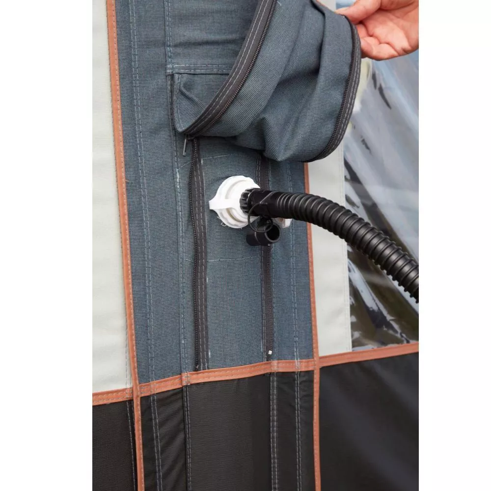 Das speziell entwickelte IsaAir System ist 3-lagig aufgebaut, um den eigentlichen Luftschlauch zu schützen. Schliesse die mitgelieferte Hochleistungspumpe an und befülle dein Vorzelt an nur einem einzigen Aufblaspunkt. Alle Schlauchelemente sind mit einem Kupplungssystem und einem Verbindungsventil verbunden. Am Ventil selbst zeigt ein einfacher On/Off-Schalter eindeutig, ob die Verbindung zwischen zwei Schläuchen zurzeit geöffnet oder geschlossen ist. Wenn du einen einzelnen Schlauch auf beiden Seiten mit der „Off“-Stellung verriegelst, kann dieser, wenn notwendig, ausgebaut werden, ohne dass das restliche System an Luft verliert. So bist du immer auf der sicheren Seite!
