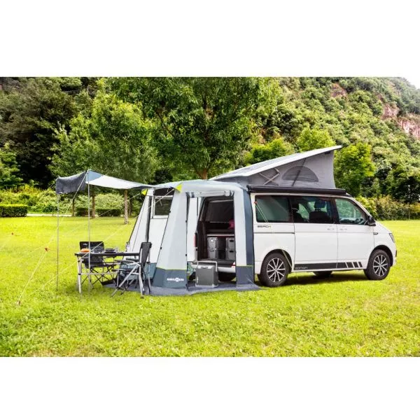 Das Heckzelt Comet von Brunner passt bestens zum VW-Bus T5 und T6. Die rahmenlose Konstruktion lässt sich einfach am aufbauen. Platziere das Buszelt über die Heckklappe deines Campingbusses. Das 2×2 Meter grosse Comet ist vielseitig einsetzbar. Es schafft 4 Quadratmeter zusätzlichen Platz am Heck, z.B. für Schlafplätze, Kochmöglichkeit oder für Stauraum, z.B. für die Fahrräder. Zwei Eingänge garantieren eine gute Belüftung und ein angenehmes Raumklima. Eine Tür lässt sich mit den mitgelieferten Aufstellstangen zu einem Schatten spendenen Sonnendach aufstellen. Befestigungsmaterial und Packtasche werden mitgeliefert. Mit einem Packmass von gerade einmal 63×18 cm nimmt das Heckzelt wenig Platz in Anspruch.