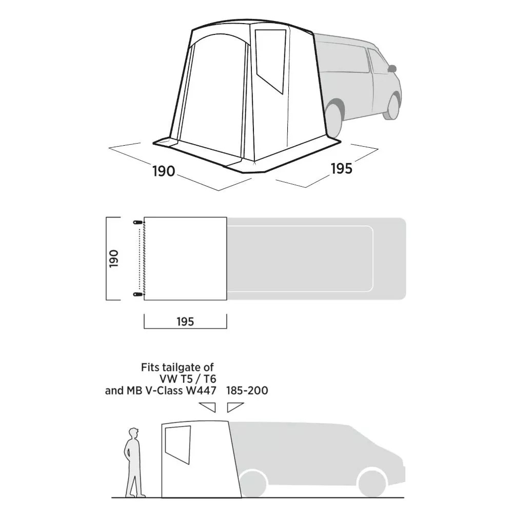 Die vielseitige Konstruktion des Easy Camp Krossbu Heckzelts schafft flexibel nutzbaren Raum für den Campingbus. Mit zwei Abspannleinen wird das Zelt schnell, einfach und sicher an der Heckklappe befestigt. Geeignet für Fahrzeuge mit einer Anschlusshöhe von 185 – 200 cm.