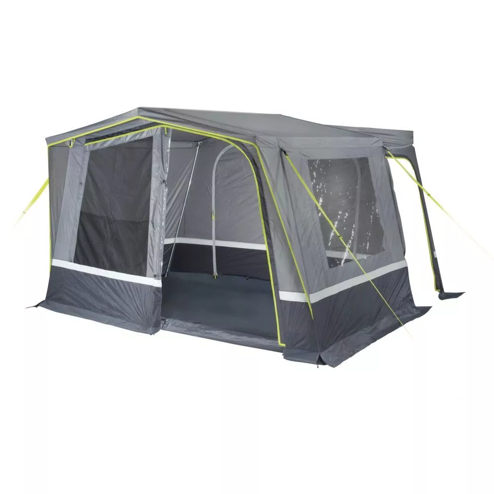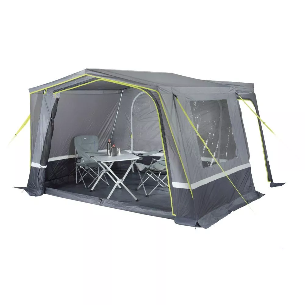 Das Busvorzelt High Peak Tramp 2.0 ist ein freistehendes Drive-Away-Vorzelt und zeichnet sich durch seine hohe Stabilität aus. Es ist ideal für Campingfahrzeuge mit einer Anschlusshöhe von 180 – 240 cm und daher auch perfekt für höhere Fahrzeuge geeignet. Durch seine verschiedenen Befestigungsmöglichkeiten am Fahrzeug ist es geeignet für jeden Camper. Die Schleuse lässt sich mittels Reissverschluss und verstellbarem Gurtband flexibel an der Fahrzeughöhe anpassen.