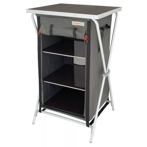 Der Faltschrank bzw. Vorratsschrank Eurotrail Aubenas ist ein Alu-Klappschrank mit Platte. Der Zeltschrank ist ideal für Proviant oder Kleidung. Er ist mit Fliegennetzen zur Entlüftung, drei Ablageböden und stufenlos verstellbaren Beinen ausgestattet. Der Campingschrank wird inklusive Trage- und Aufbewahrungstasche geliefert.