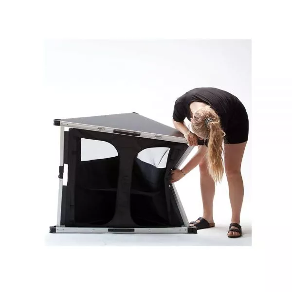 Für alles bestens gerüstet sind Sie auf jeden Fall mit dem Isabella Eckschrank. Praktisch sind die eingearbeiteten Lüftungsgitter und der Klett, mit dem sich die aufgerollten Türen fixieren lassen. Die Oberflächen sind sehr sehr stabil verarbeitet und mit Aluminium eingefasst, was diese auch stossfest macht. Auch sind alle Oberflächen und auch der Bezug (besteht zu 60% aus PVC und 40% Polyester) sehr leicht zu reinigen. Ein stabiler, einfacher und intuitiver Klapp-Mechanismus sorgt dafür, dass die Möbel rasch aufgebaut werden können und im Urlaub keine Zeit verloren geht. Durch das Konstrukt aus Aluminium und Kunststoff ist der Isabella Faltschrank nicht nur stabil und belastbar, sondern auch sehr leicht. Zudem ist im Lieferumfang eine praktische Transporttasche mit Griffen zum leichten Verstauen enthalten.