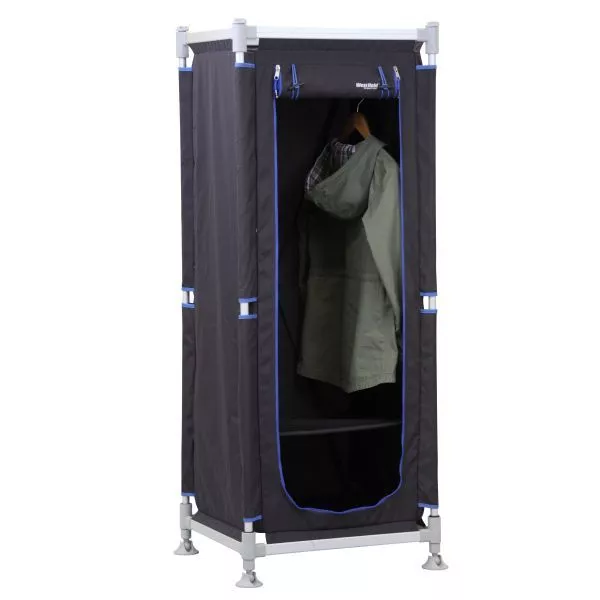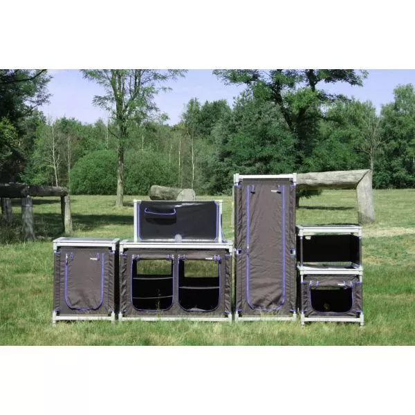 Die ModuCamp-Serie von Westfield besteht aus drei Schrankmodulen und verschiedenen Erweiterungsmodulen. Die Schränke sind in beliebiger Reihenfolge mit Hilfe spezieller Verbindungselemente kombinierbar. Jeder Schrank lässt sich uneingeschränkt einzeln nutzen und kann mit jedem Erweiterungsmodul versehen werden. Der integrierte Aluminiumrahmen sorgt für hohe Stabilität des Schrankes, dadurch können an vielen Stellen Zubehörteile angebracht werden. Der Aufbau erfolgt schnell und unkompliziert dank des Aluminiumrahmens: An eingeschraubten Stangen wird der Textilkörper einfach nach oben gezogen und fixiert. Die Regalböden sind in beliebiger Position und Anzahl einsetzbar, die Standfüsse höhenverstellbar. Eine Transport- und Aufbewahrungstasche ist bei allen Modellen im Lieferumfang enthalten.