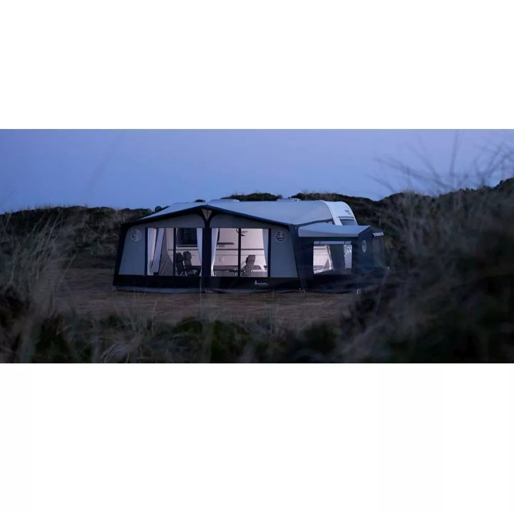 Das grosse Isabella Commodore North A1050/G20 ist ein grosses Wohnwgenvorzelt in stilvollem und modernem Design. Es bietet genügend Platz für die ganze Familie. Das atmungsaktive Isacryl-Gewebe in den Vorder- und Seitenwänden sorgt, in Verbindung mit dem einseitig beschichtetem Dach (Textilunterseite), für ein gutes Raumklima. An heissen Tagen können die Vorder- und Seitenwände zu einer Veranda heruntergeklappt oder komplett herausgenommen werden, so dass ein grosses Sonnendach entsteht. Das Wohnwagenvorzelt bietet mit 300 cm Vorzelttiefe viel Platz für die ganze Familie. Der Aufbau ist im Vergleich zu einem 250 cm tiefen Vorzelt nicht viel grösser. Das leichte CarbonX-Glasfibergestänge verleiht dem Vorzelt gute Stabilität und eignet sich bestens fürs Reise- und Saisoncamping.