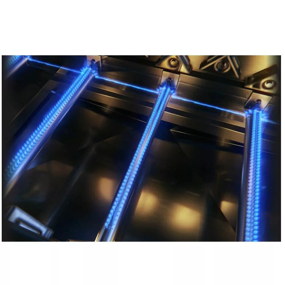 Sollte das Grillvergnügen etwas länger dauern, ermöglichen die neuen, mehrfarbigen SAFETY GLOW Drehregler auch bei Dunkelheit für eine präzise Bedienung. Deren integrierte Hintergrundbeleuchtung wechselt zum Beispiel von blauem auf rotes Licht sobald das Gas strömt. Ein praktisches und sicherheitsspendendes Feature. Die Halogen-Innenbeleuchtung des Garraums sorgt wiederum dafür, dass auch bei dunklen Außenverhältnissen nichts anbrennt. Aber manchmal geht es auch einfach um einen coolen Look: Die bewegungsaktivierte Bodenprojektion des Napoleon Logos – Proximity Lighting – steigert die Hochwertigkeit des Modells noch weiter. Die komplette Edelstahl-Ausstattung garantiert Langlebigkeit und Leistung. Und die Chrom-Akzente verleihen dem Grill mehr als eine Spur Luxus. All das macht immer wieder klar: dieser Grill ist ein echter PRO.