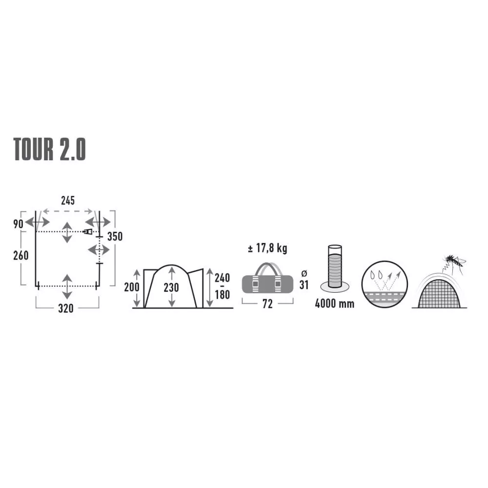 Der Schleusenkanal mit Hohlsaum ist inklusive Schleusen-Stange und angenähtem Doppelkeder-Streifen mit 5,8 / 7,2 mm. Die Anschlusshöhe beträgt 180 – 240 cm. Das Tour kann sowohl als Busvorzelt und als herkömmliches Übernachtungszelt verwendet werden – ein echtes Multitalent!