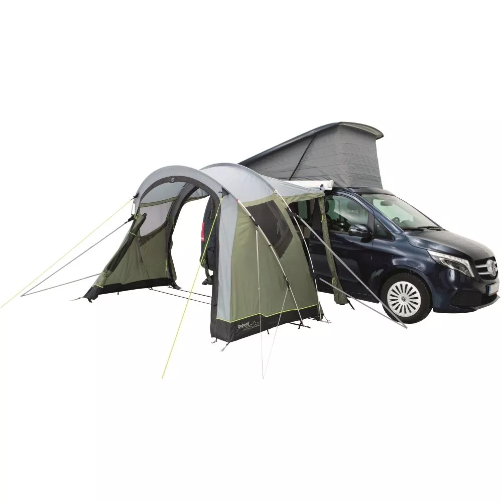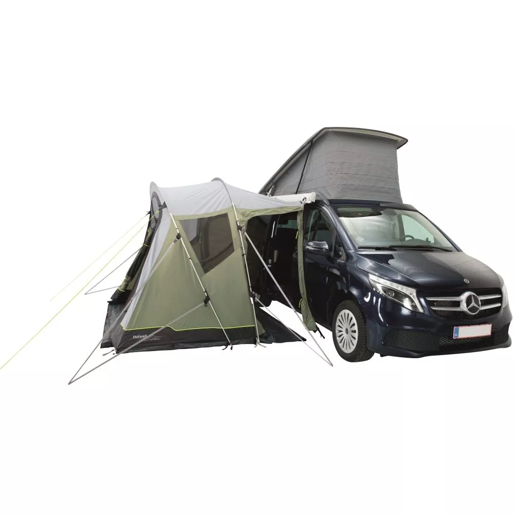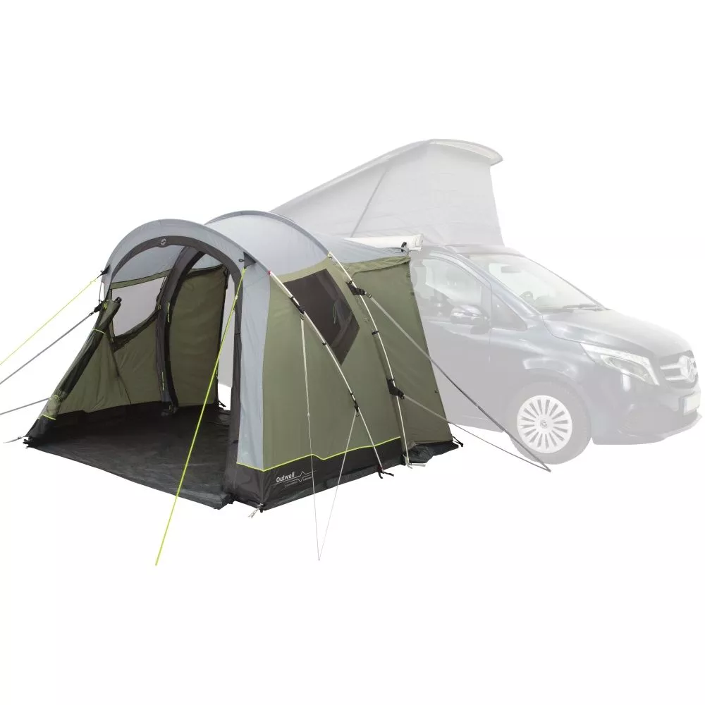 Das kleine freistehende Buszelt Outwell Lakecrest ist geärumig, vielseitig und bietet flexible Anbau-Optionen. Durch die zwei leichten Aluminium-Gestängebögen gelingt ein einfacher und schneller Aufbau des Vorzelts. Es lässt sich an Campingbusse mit einer Höhe zwischen 175 bis 200 cm anbringen. Dank des doppelten Keders mit 5+7 mm ist das Lakecrest für nahezu alle Befestigungsleisten geeignet, egal ob Kederleiste, Markise oder VW California Rail. Aufgestellt wird es mithilfe von partiellen Stangenkanälen und Klemmen für den farblich gekennzeichneten Rahmen.