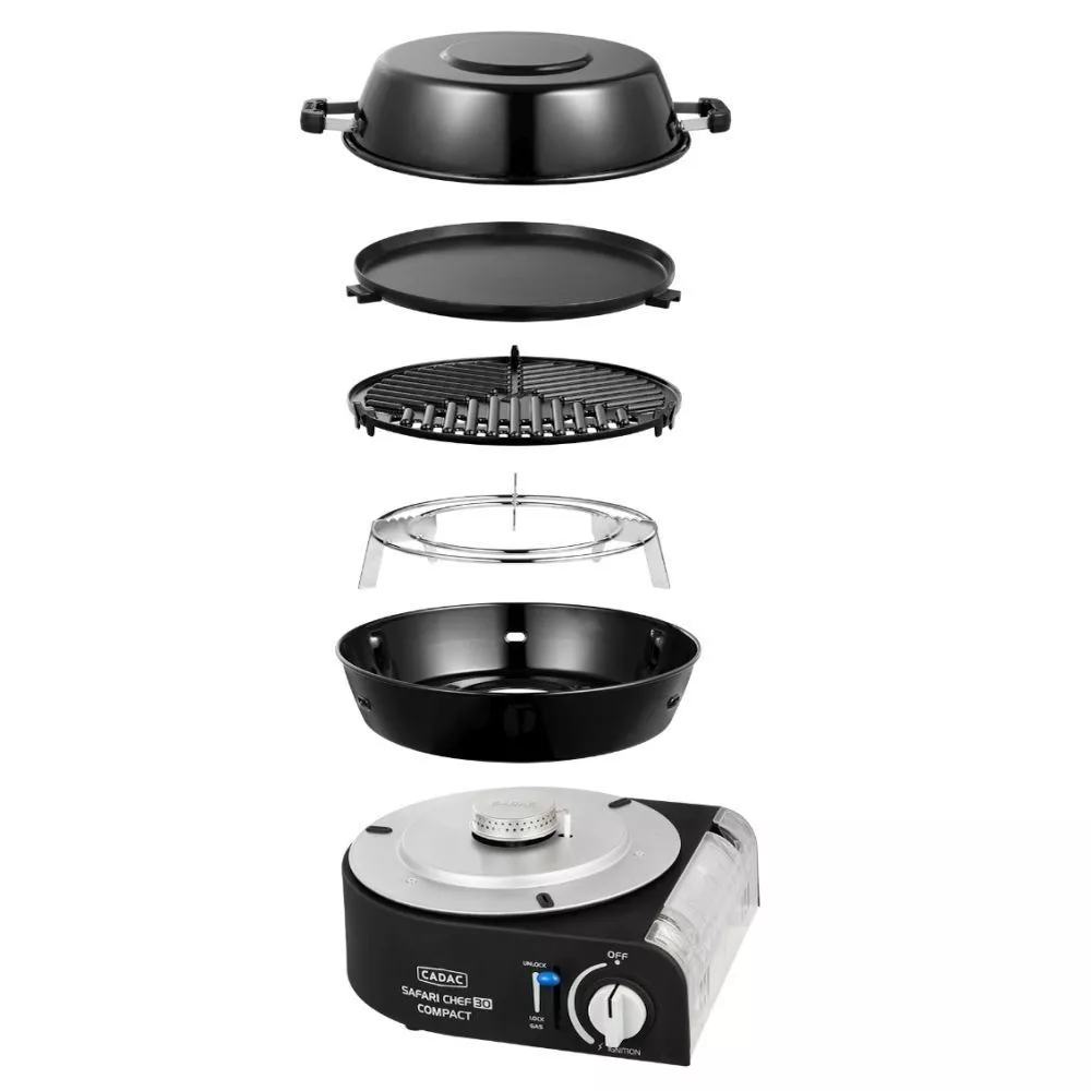Der tragbare Gasgrill Cadac Dometic Safari Chef 30 Compact wird mit einer handelsüblichen 227g-Bajonettkartusche betrieben. Er kann durch sein kompaktes Mass und seine Leichtigkeit überall mitgenommen werden – Gaskartusche anschliessen und schon kann es losgehen!