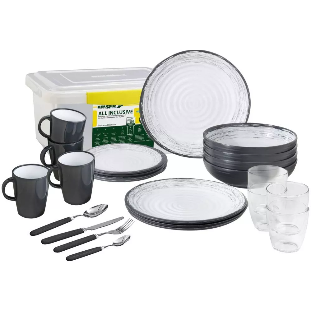 Mit dem Campinggeschirr-Set Brunner All Inclusive Granada erhältst du eine umfangreiche 36-teilige Grundausstattung für 4 Personen, ideal für den täglichen Gebrauch auf dem Campingplatz. Für einen schön gedeckten Tisch ist farblich alles passend aufeinander abgestimmt. Das Set beinhaltet Essteller, Suppenteller, Kuchen- bzw. Desserteller, hitzebeständige Tassen, grosse Trinkbecher und ein Besteckset mit Gabeln, Messern, Löffeln und Kaffee- bzw. Dessertlöffeln. Zur platzsparenden Aufbewahrung und zum besseren Transport wird das Geschirrset in einer praktischen Box geliefert. Stone Touch Melamin (Teller), Resylin (Tassen) und SAN (Gläser) sind hochwertige Kunststoffe, die sich aufgrund vieler Eigenschaften besonders gut den täglichen Outdoor-Einsatz eignen.