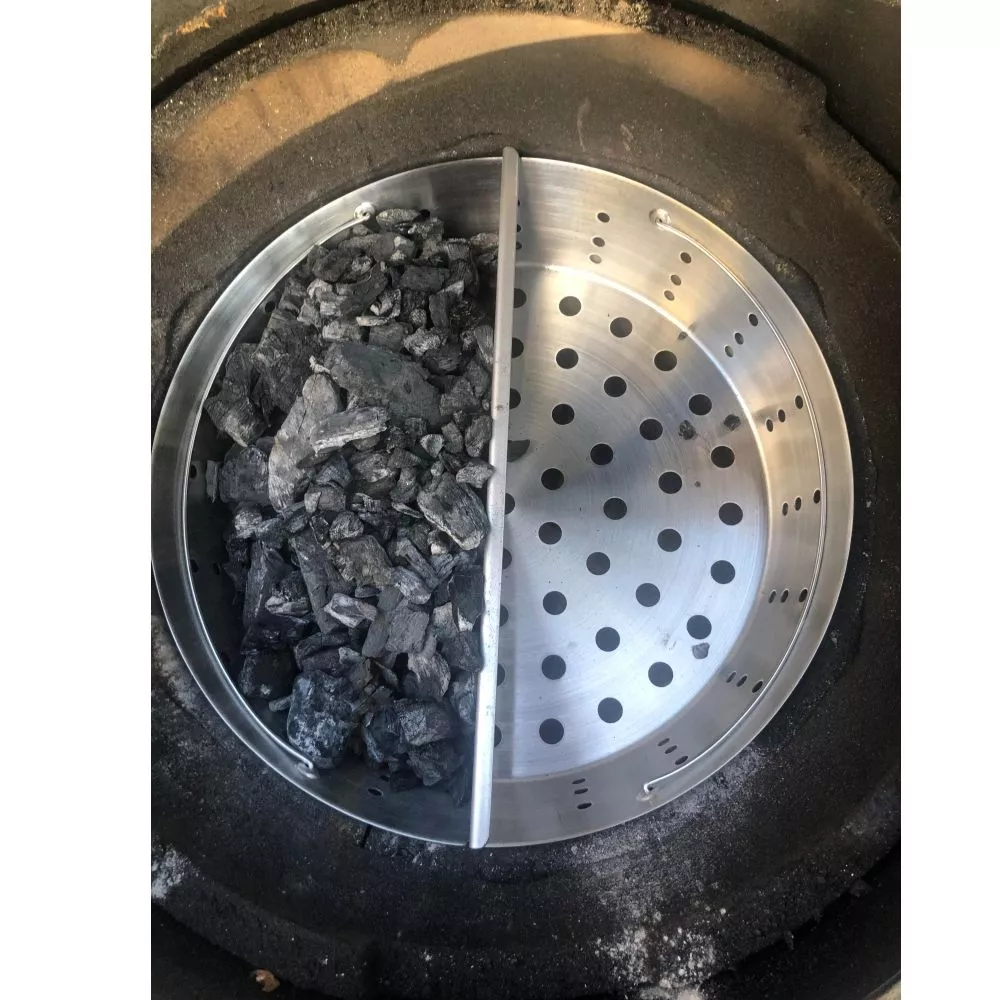 Dieser Holzkohlekorb aus Edelstahl hilft dir bei der Entfernung der Asche aus der Holzkohle. Halte hierfür einfach den Holzkohlekorb mit der kalten Holzkohle über einen Abfalleimer und schüttel die Asche heraus. Das garantiert einen maximalen Luftdurchfluss durch die Holzkohle, sodass dein Keramikgrill noch schneller startet.