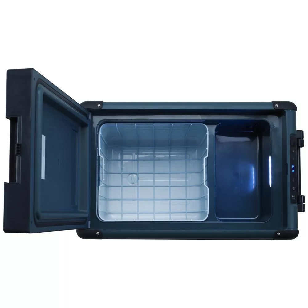 bietet Platz für bis zu 56 330 ml Dosen oder 8 1,5 Liter Flaschen Digitalanzeige zur bequemen Temperatureinstellung mit Display-Dimmfunktion und USB-Anschluss bequemes Steuern über Bluetooth oder WiFi per Smartphone über die mobile Cooling App ergonomische, klappbare Griffe unterteilbarer Innenraum mit herausnehmbarem Korb für optimale Organisation integriertes LED-Innenlicht für bessere Sichtbarkeit, auch in dunkler Umgebung intuitive Verriegelung ist bequem mit einer Hand zu öffnen mit funktionaler Ablassschraube für eine einfache Reinigung 5 Volt, 2 Ampere USB-Anschluss niedriger Stromverbrauch dank leistungsstarkem und effizientem Kompressor mit Drehzahlregelung stabiles Design mit verstärkten Ecken, Edelstahlscharnieren und einem stabilen abnehmbaren Deckel 3-stufiger Batterieschutz schützt die Fahrzeugbatterie vor zu starker Entladung M6 Gewindeeinsätze im Fuss für die Montage inklusive 2 Meter Stromkabel |