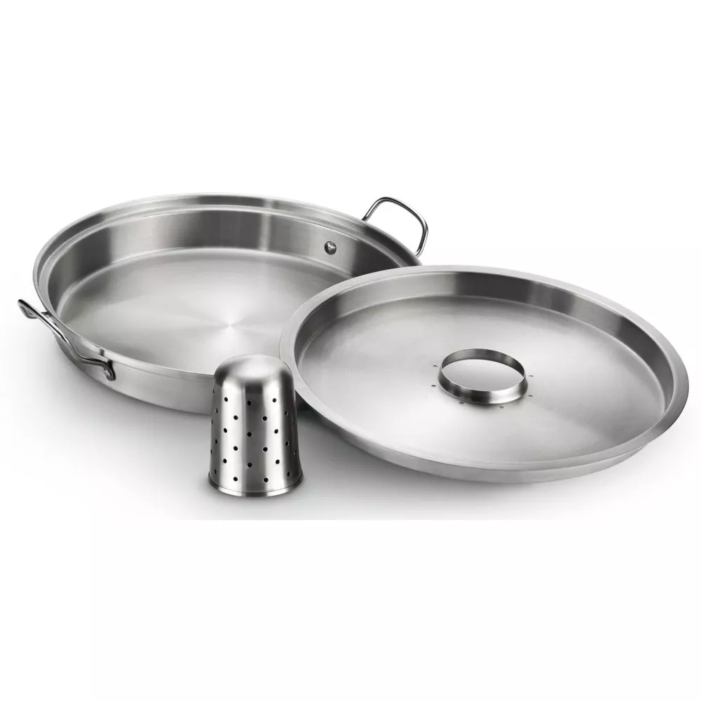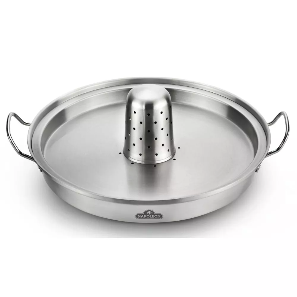 Der Napoleon 3in1 Geflügelhalter aus Edelstahl, bestehend aus drei einfach abzunehmenden und spülmaschinenfesten Teilen. Flüssigkeit in die untere Pfanne giessen, Deckel einsetzen, darauf kann Gemüse gegart werden. Anschliessend den Hähnchenhalter-Aufsatz montieren und das Hähnchen darauf platzieren.