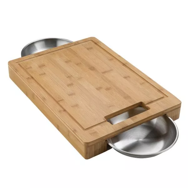 Das Hochwertiges Bambus-Schneidebrett von Napoleon mit 2 Edelstahlschalen zum Auffangen von Fleischsäften und geschnittenem Gemüse.