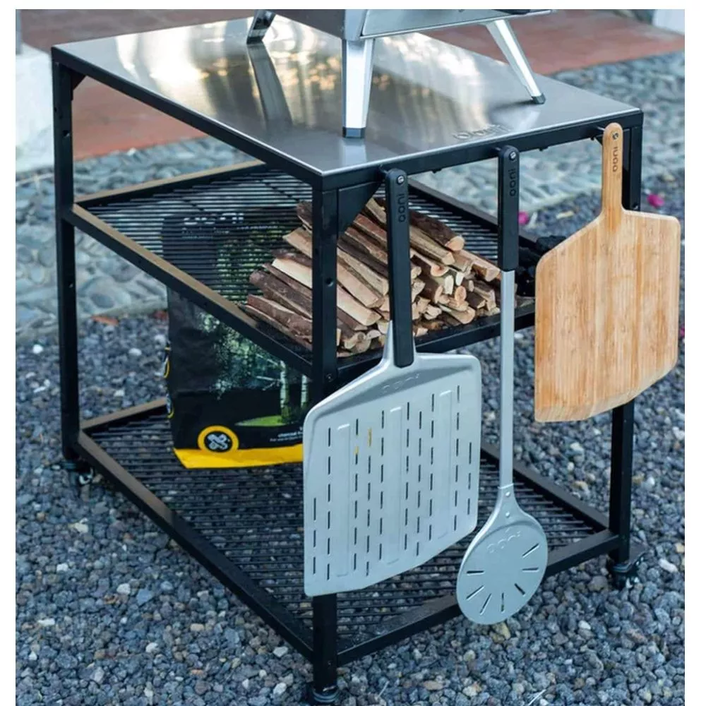 Der Ooni Modultisch eignen sich ideal als Standfläche für deinen Pizzaofen und dein Zubehör. Alle Ooni Pizzaofen-Modelle passen wunderbar auf die Edelstahl-Arbeitsfläche. Die Tische werden aus robustem pulverbeschichtetem Karbonstahl hergestellt. Sie verfügen auch über zwei höhenverstellbare Einlegeböden sowie integrierte Haken für deine Ooni Pizzaschieber und das Zubehör. Dank der zwei feststellbaren Rollen steht dein Tisch beim Kochen sicher.