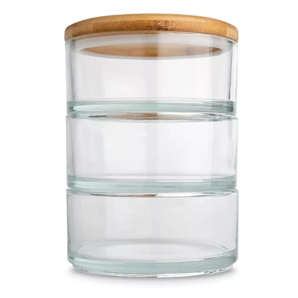 - bestehend aus drei Glasschalen mit Bambusdeckel