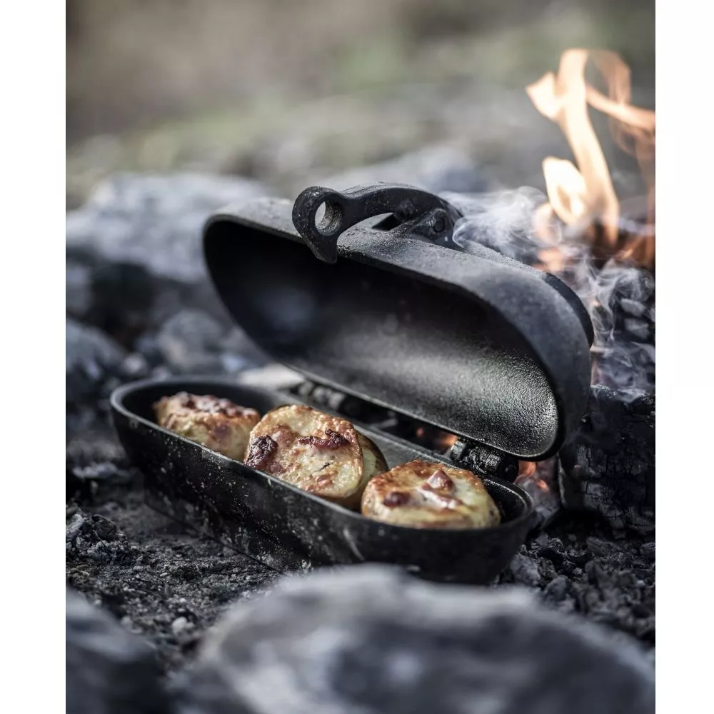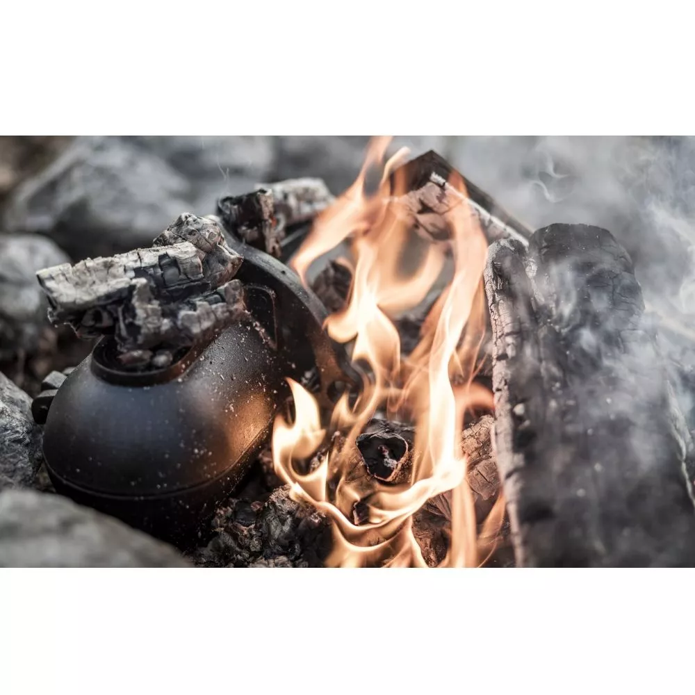Die Sonderform aus Gusseisen umschliesst ihren Inhalt komplett. Dank der runden Bauform und der ausgezeichneten Materialeigenschaften des Gusseisens wird die Wärme gleichmässig um den Inhalt verteilt. Das sorgt für ein ideales Garergebnis, ohne ein Austrocknen der Speisen. Zusätzlich nehmen die Kartoffeln die charakteristischen Röstaromen der Glut auf und liefern ein kräftiges Geschmackserlebnis. Auch mit anderen Speisen, wie Rinderfilet, Geflügelbrust, Süsskartoffelspalten, gefüllten Paprika oder Zucchini, steht der Abwechslung bei der outdoor-Küche nichts im Wege.