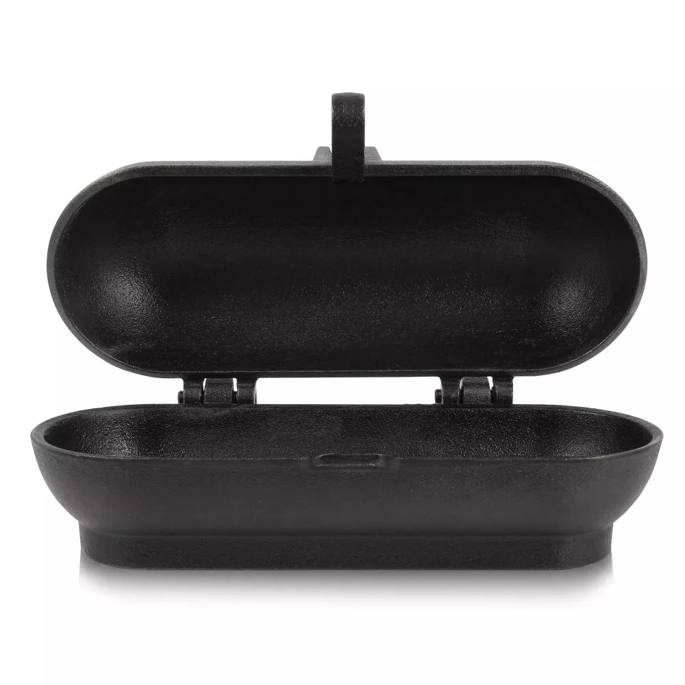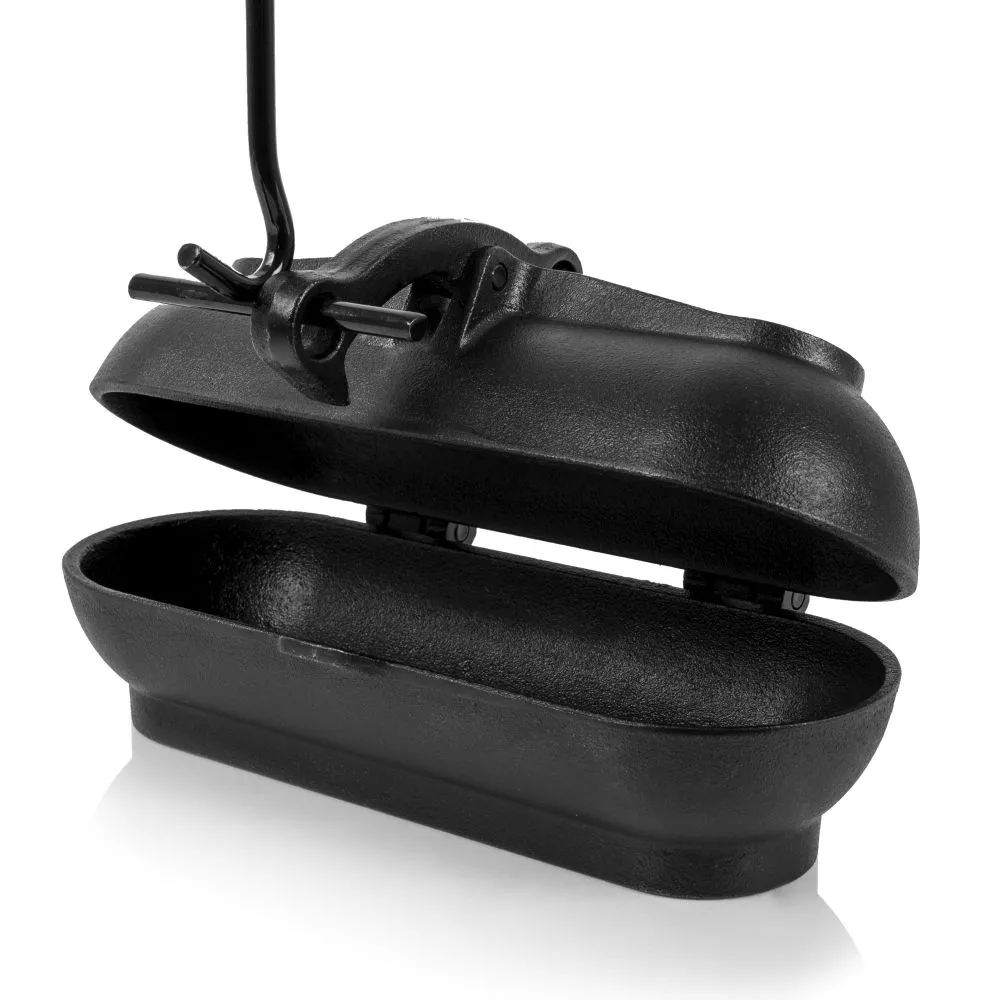 Der speziell entwickelte Kippriegelmechanismus vereinfacht die Arbeit am Feuer: Mit einem in die obere Öse eingehaktem Deckelheber lässt sich der Kartoffelbräter ganz einfach platzieren oder herausheben. Dabei hält das untere Ende des Kippriegels die Bräter-Hälften fest zusammen und sorgt dafür, dass der Inhalt nicht herausfällt. Wird der Deckelheber an der unteren Öse des Kippriegels angesetzt, so wird die Gussform geöffnet, ohne eine Verbrennung von Fingern oder Händen zu riskieren. Dank des erhöhten Randes lassen sich Glut & Co. auf der Deckeloberseite ablegen und die Oberhitze wird wirkungsvoll genutzt. Der am Boden des Bräters verlaufende Steg bildet eine ebene und sichere Abstellfläche. Damit ist die gusseiserne Sonderform sowohl für das Glutbett, den Grillrost als auch den heimischen Ofen geeignet. Der Steg ist an der Rückseite verlängert, wodurch ein kippsicheres Öffnen des Kartoffelbräters gewährleistet wird.