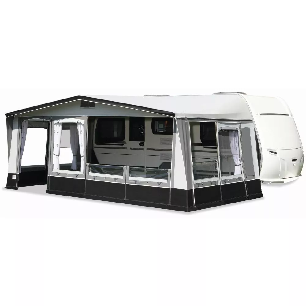 Beim Premium-Vorzelt brand Palazzo 240 kommt für das Dach und die Seitenwände ein robustes PVC-Material zum Einsatz. Die Vorderwand wird aus atmungsaktivem Ten Cate – Gewebe gefertigt. Verschliessbare Fensterklappen, Erdstreifen aussen und innen, Wetterschutzabdeckung der Reissverschlüsse, 3-fach-Seitenfenster, Gardinen und ein robustes 28 mm Stahlrohrgestänge mit PowerGrip und Vordachverstärkung vervollständigen die umfangreiche Serienausstattung. Das Design ist elegant und zeitlos. Ein ideales Wohnwagenvorzelt für alle Saison- und Ganzjahrescamper.