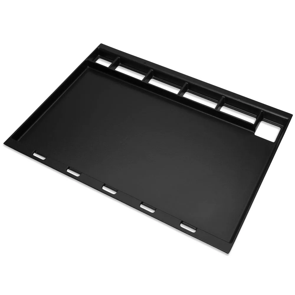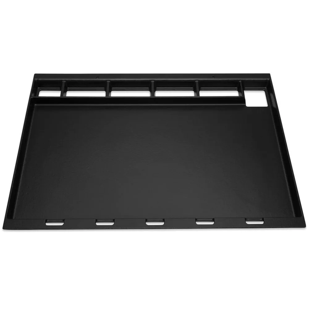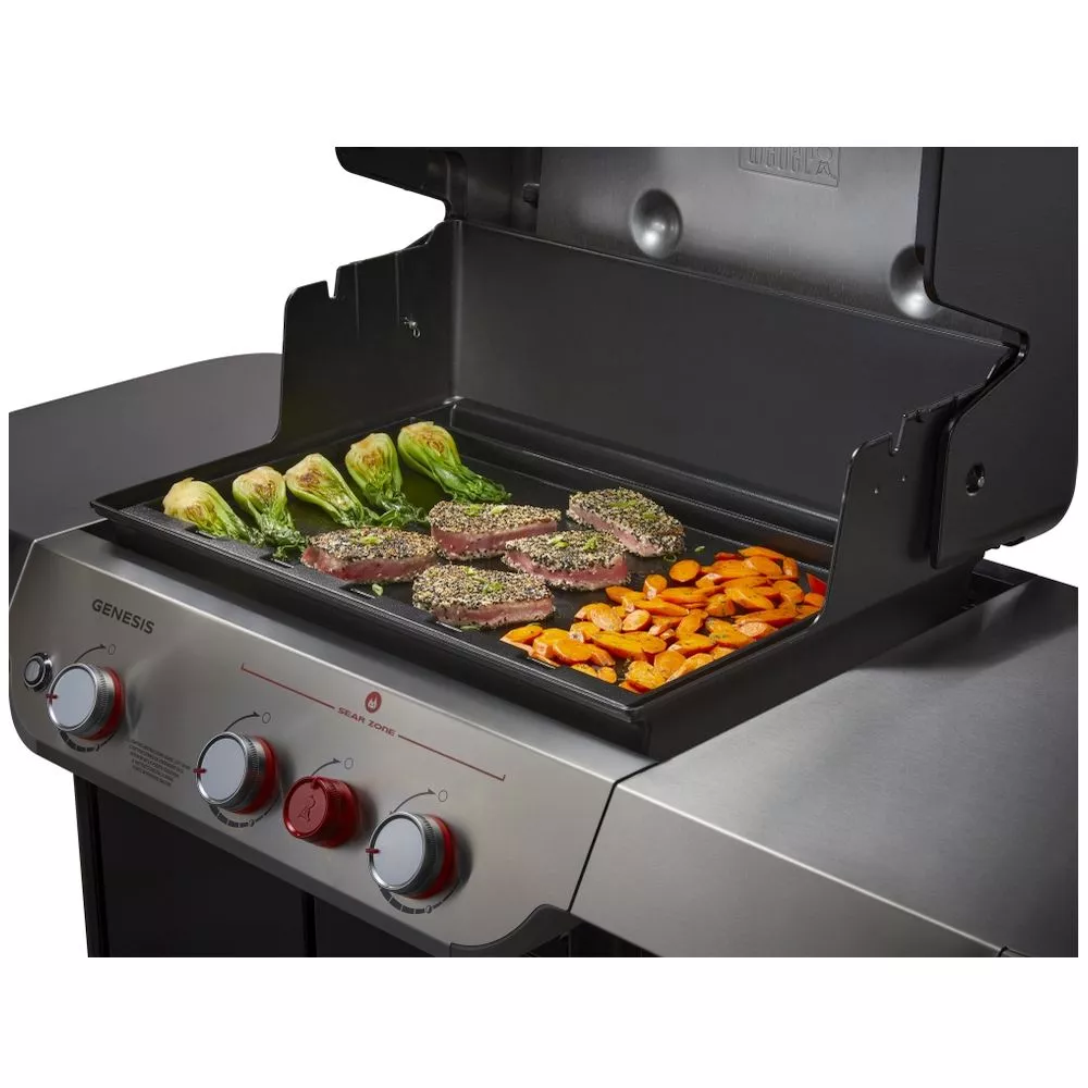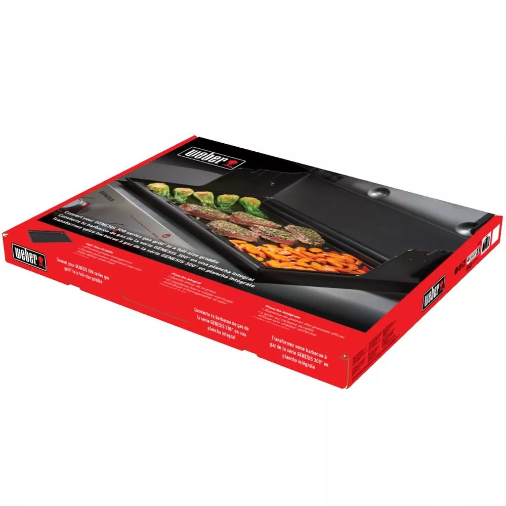 Mit der Weber FillSize Grillplatte aus porzellanemailliertem Gusseisen lässt sich der Grill in einen vollwertigen Flat Top Grill umrüsten. Die Platte mit gezieltem Fettablaufmanagement ersetzt den gesamten Rost. Die Platte ermöglicht eine gleichmässige Hitzeverteilung und sorgt für eine schnelle Aufheizzeit. Die Plancha ist passend für alle Modelle der Genesis 300-Serie ab 2017.
