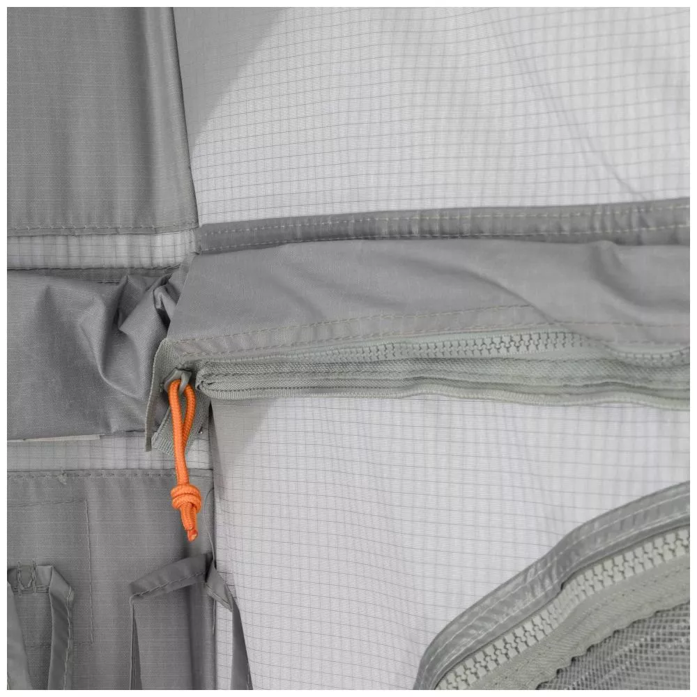 Im Vorzeltdach sind 2 Fenster integriert, wodurch viel Tageslicht ins Zeltinnere gelangt. Zusätzlichen ermöglichen die Fenster auch bei geschlossenen Gardinen einen wundervollen Ausblick nach draussen. Die Front- und Seitenwände sind jeweils mit grossen Fenstern ausgestattet, die ebenfalls für einen hellen Wohnbereich sorgen. An heissen Tagen können die Wände mittels der optional erhältlichen Verandastange entweder zum beliebten Verandaeffekt abgeklappt oder per Reissverschluss komplett abgezippt werden. Wer das Vorzelt hingegen lieber nicht komplett öffnen möchte kann zum Lüften auch einfach nur das Fenster und die Türen vor den Moskitonetzen öffnen.