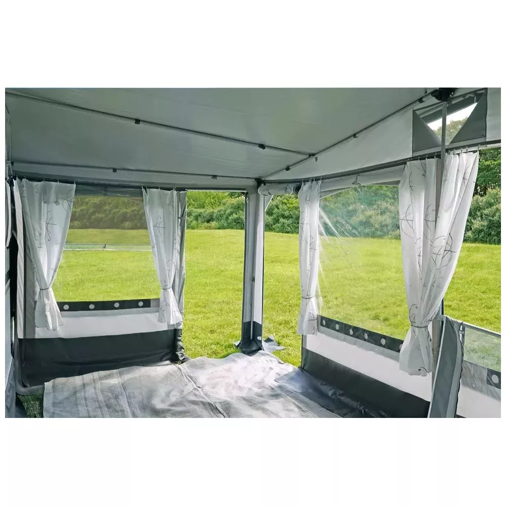 Grosse Fenster an allen Wandelementen sorgen für viel Tageslicht im Wohnraum. Die zweiteilige, gegeneinander austauschbare Vorderwand ermöglicht eine freie Wahl der Türposition, entweder mittig oder rechts am Vorzelt. Die beiden Seitenwände haben jeweils einen Eingang und Fenster mit Klarfolie, Moskitogaze und dunkler Abdeckung. Dadurch kannst du je nach Stellplatz und Einrichtung des Wohnbereichs frei entscheiden, welchen Vorzelteingang du nutzen möchtest. Zudem bieten dir die 3 Eingänge auf beengten Stellplätzen viele Vorteile.